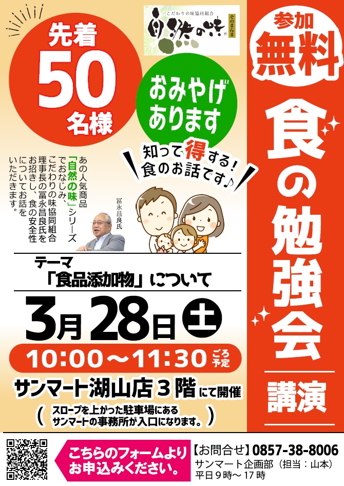 サンマート湖山店にて あの人気商品「自然の味シリーズ」でおなじみ こだわりの味協同組合理事長の冨永昌良氏をお招きして『食品添加物』についてお話をいただきました。